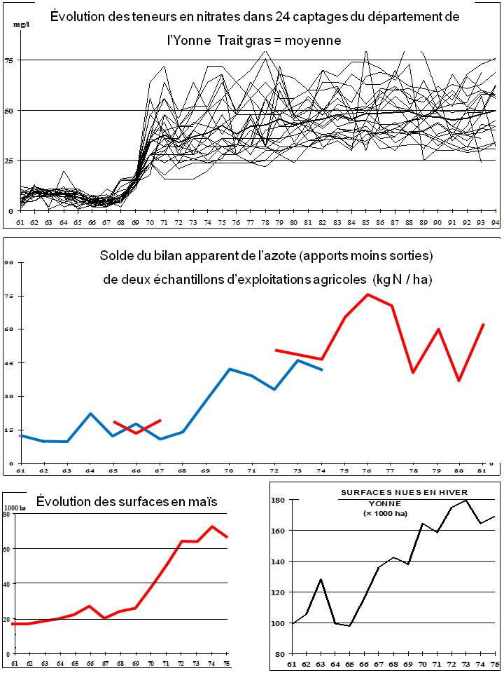 Évolution comparée des taux de nitrates dans des captages et d’indicateurs agricoles dans le département de l’Yonne (Morlon et al., 1998)
