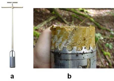 Tarières racinaires. a) Modèle Eijkelkamp. b) Détail d’une couronne de forage (© photo É. Lucot).