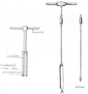 « Lorsque l’on veut défricher un terrain, il faut d’abord le faire sonder en divers endroits, à huit ou dix pieds de profondeur, afin d’en connaître la qualité, & l’épaisseur des différentes couches de terre, qui s’y rencontrent. On les trouvera toujours posées horizontalement…. Cette épreuve se fera à peu de frais, au moyen d’une sonde, composée de deux barres de fer arrondies, de six pieds de long chacune & de deux pouces de grosseur, qui se vissent l’une dans l’autre ; elles sont toutes les deux percées : savoir, la première à trois, quatre & cinq pieds de hauteur ; & la seconde de pied en pied, pour y pouvoir passer de petites chevilles de fer, qui servent à retenir une manivelle, ou manche de bois de deux pieds de longueur, & cinq à six pouces de grosseur, au milieu duquel, il y a un trou suffisant par où ces barres passent, en sorte que cela forme la figure d’une Croix. C’est par ce manche de bois, qu’on tient la sonde, & qu’on l’enfonce successivement en commençant par la première barre, soit en la tournant dans la terre, soit en la haussant & baissant avec force, lorsqu’on rencontre des pierres. On place au bout de cette première barre, une pointe d’acier, de quatre pouces de long, forte & point trop aiguë ; elle se visse aussi dans la même barre, à laquelle quatre pouces plus haut, l’on a fait faire une ouverture ou rainure d’un côté, d’un demi-pied de long, pour recevoir la terre. Telle est la construction de cette sonde. Quand on s’en sert, on la retire à mesure, de six pouces en six pouces, pour voir l’espèce de terre ou de pierres contenue dans la rainure ; il est nécessaire de se pourvoir de cet instrument, qu’un homme ou deux font aller aisément. J’ai vu sonder de cette façon, à plus de cent pieds de profondeur, pour chercher de la mine, l’opération était semblable ; le nombre des barres de fer de même longueur, entrant pareillement les unes dans les autres & percées de pied en pied, était seulement multiplié. Quand il y en avait un certain nombre, en les levant & les laissant retomber, leur propre poids les faisait entrer à chaque fois fort avant dans la terre, & percer même les rochers les plus durs. On avait des pointes d’acier de différentes formes, pour succéder à celles qui s’usaient. On mettait même quelquefois à leur place, une mèche ou une cuiller très-coupante, dans le goût de celles dont se servent les Charpentiers, laquelle rapportait de la matière du fond. Le plus long de ce procédé était le dévidage de toutes ces barres de fer, qu’on était obligé de réitérer souvent pour voir de degré en degré, les changements & la nature de l’intérieur. En remontant ces barres on les arrêtait successivement par des chevilles de fer qu'on passait dans les trous faits pour tenir le manche, & qui étaient aussi destinés pour cet usage ; sans cela, on aurait couru risque, lorsque l’on changeait le manche de place, qu’elles n’eussent échappé & retombé au fond, d’où il aurait été souvent difficile & même très-coûteux de les retirer. » (Turbilly, 1760 : 1-5).