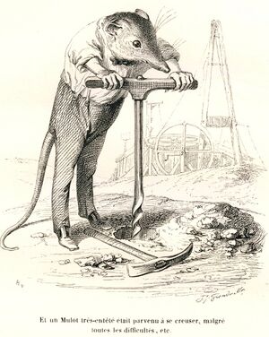Enfin rappelons, grâce à notre collègue Jean-Pierre Rossignol, que la tarière fit l’objet d’une illustration amusante par l’illustrateur humoriste Grandville (1803-1847) montrant un “Mulot très-entêté” en train de creuser son trou à l’aide d’une tarière (Figure 2).